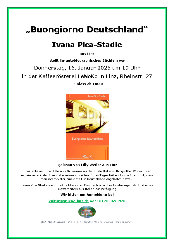 Wir bitten um Anmeldung bei kultur@gruene-linz.de oder 0170 3690970.